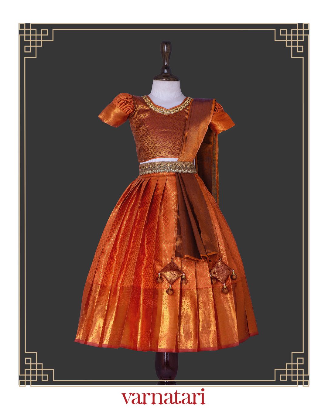 - Orange and Rust Jacquard print top and skirt with copper flower patterns ย and copper Kanchi border, Copper Tissue Dhupatta and Kundan stone fabric hip belt