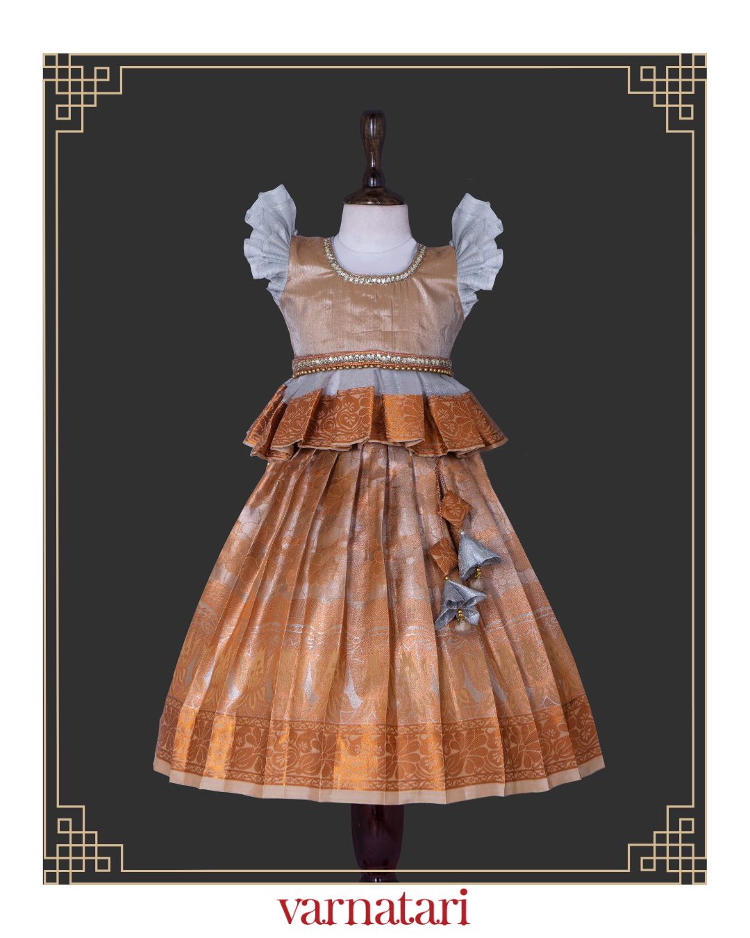 - Shades of Copper and Silver peplum top and Skirt with Copper flower Patterns and Copper Kanchi Border, Kundan Stone and beads fabric hip belt
