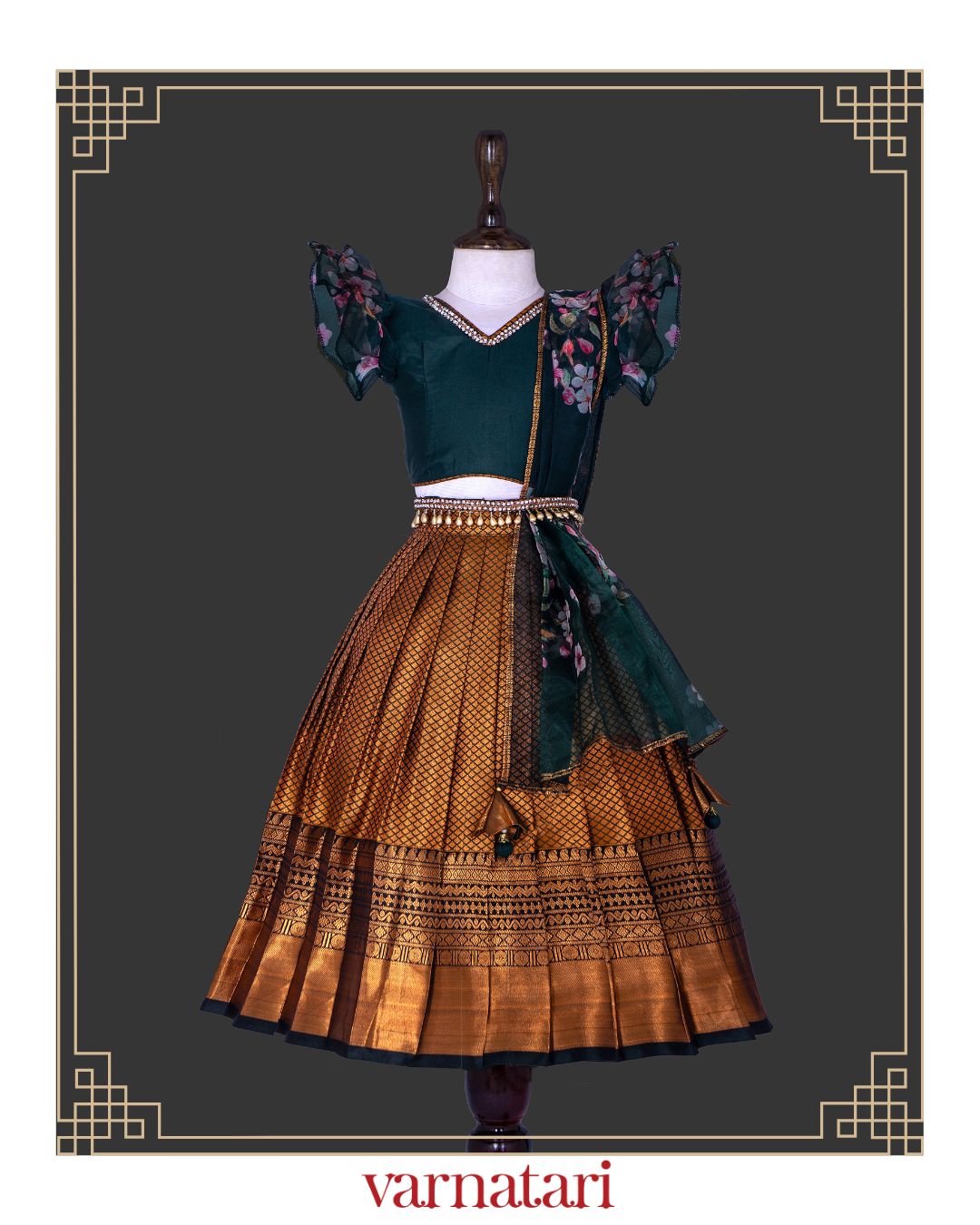 - Emerald Green top and skirt with copper flower patterns ย and copper Kanchi border, Green Organza Dhupatta and Kundan stone fabric hip belt