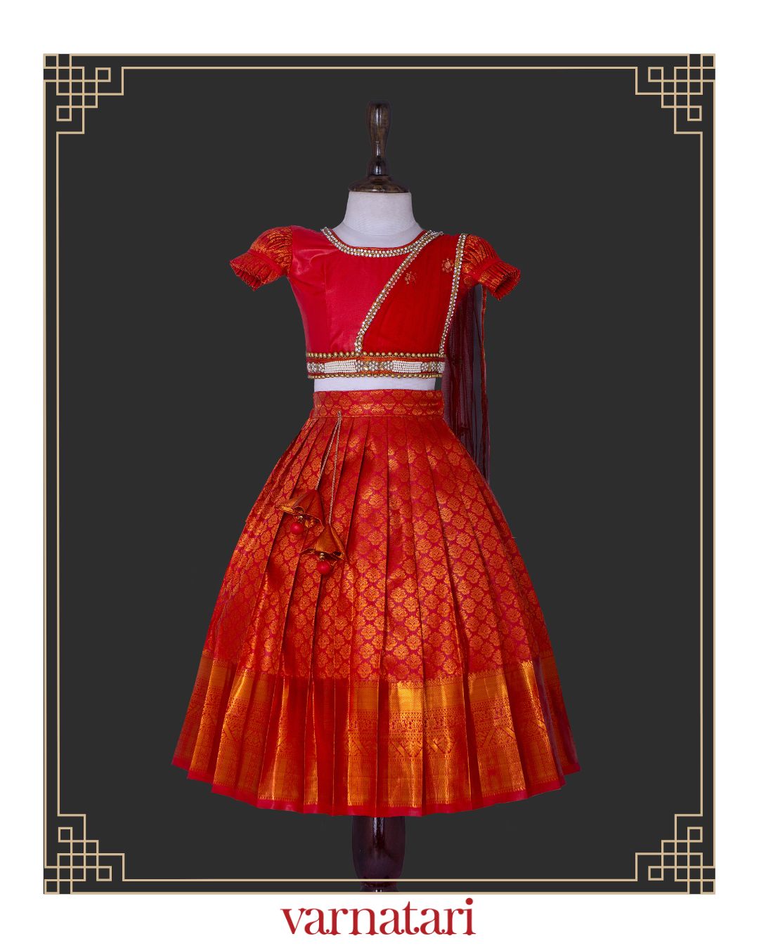 - Red top and skirt with Antique Gold flower patterns ย and gold Kanchi border, Red Net Dhupatta and Kundan stone fabric hip belt