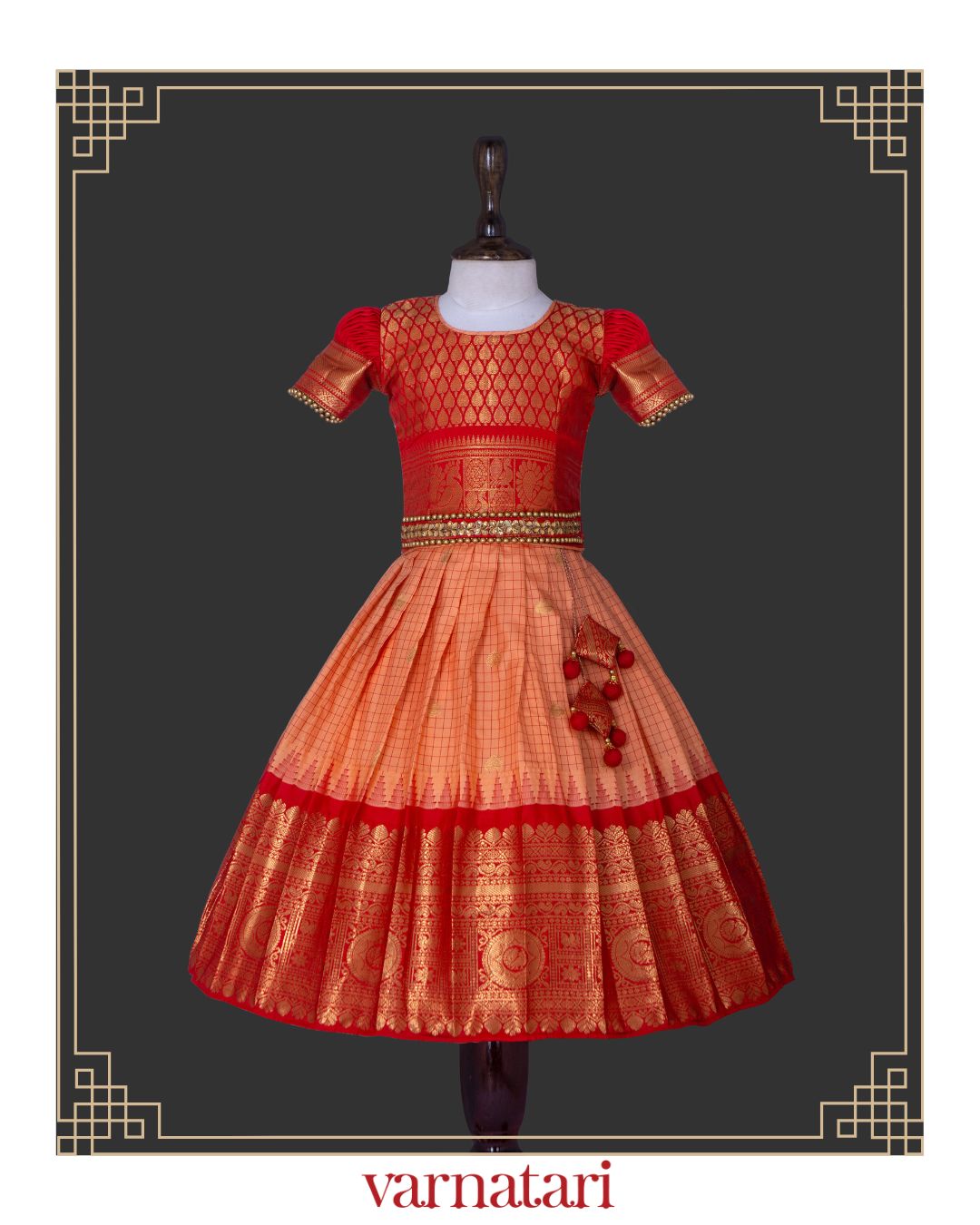 ₹2,799.00SCARLET RED AND PEACH PATTU PAVADAI SET