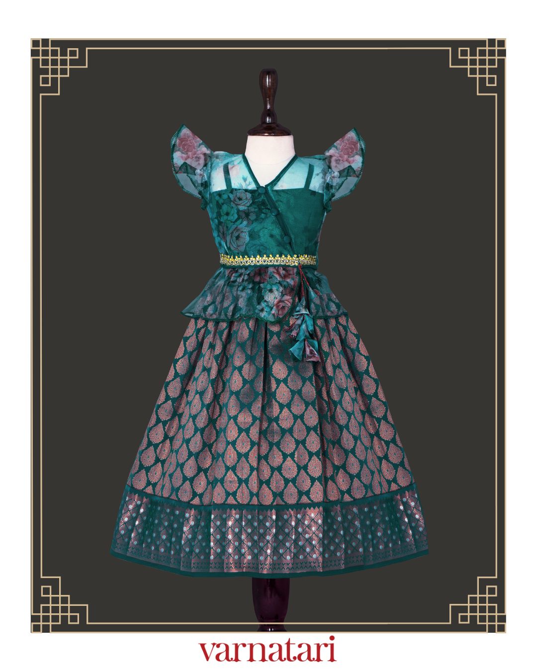 - Aqua Green and copper Jacquard print top with peplum and skirt with copper flower patterns ย and copper Kanchi border, Pink Tissue Dhupatta and Kundan stone fabric hip belt