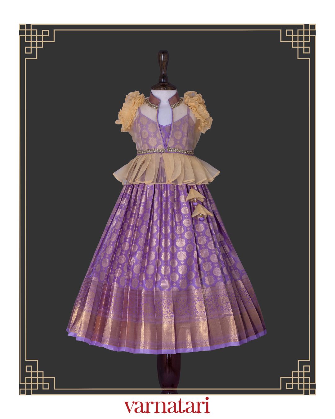- Lavender and Light Gold Ethnic Anarkali with gold jacquard flower prints and Gold Kanchi border, topped with Gold Organza Coat