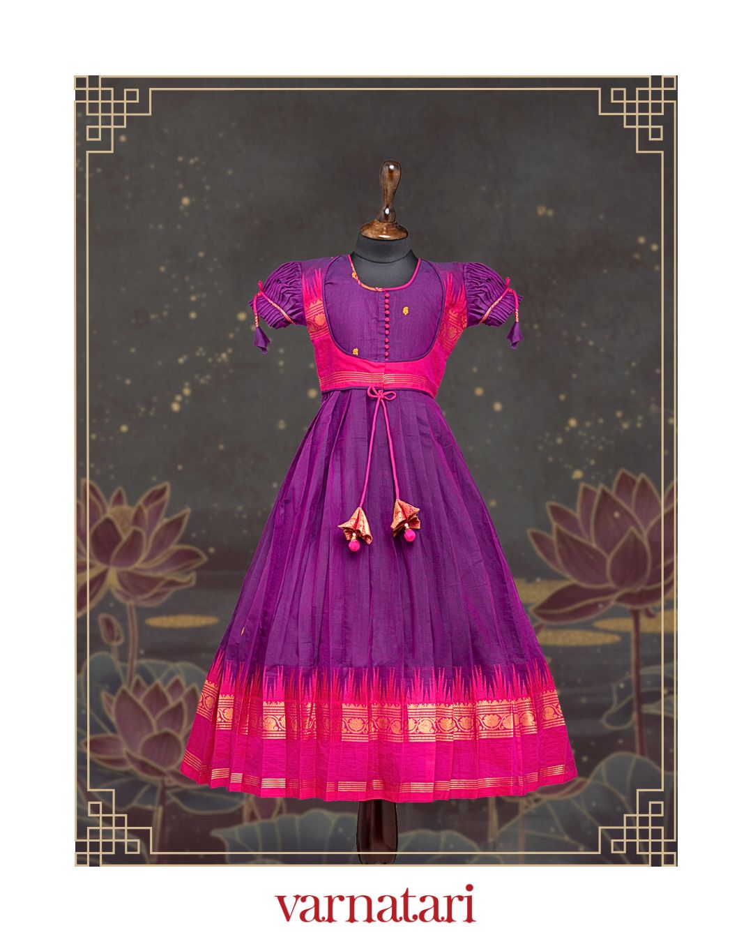 - Violet and Pink Ethnic Anarkali and Gold Kanchi border, topped with Pink Coat