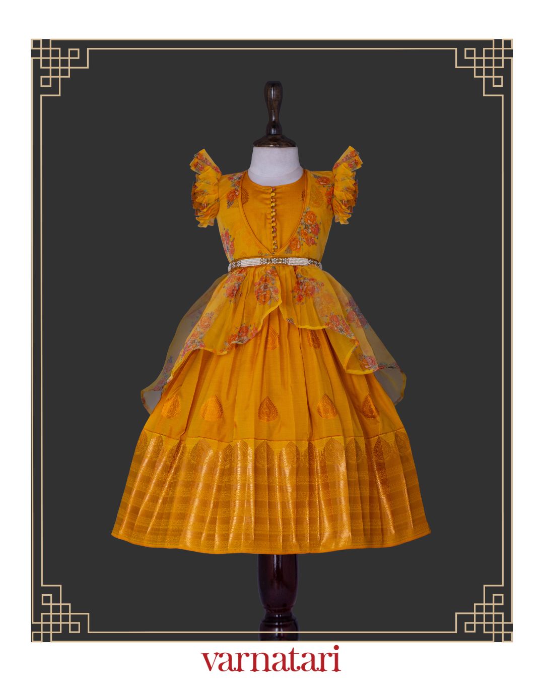 ₹2,999.00GOLDEN YELLOW AND FLORAL YELLOW ORGANZA ETHNIC ANARKALI DRESS