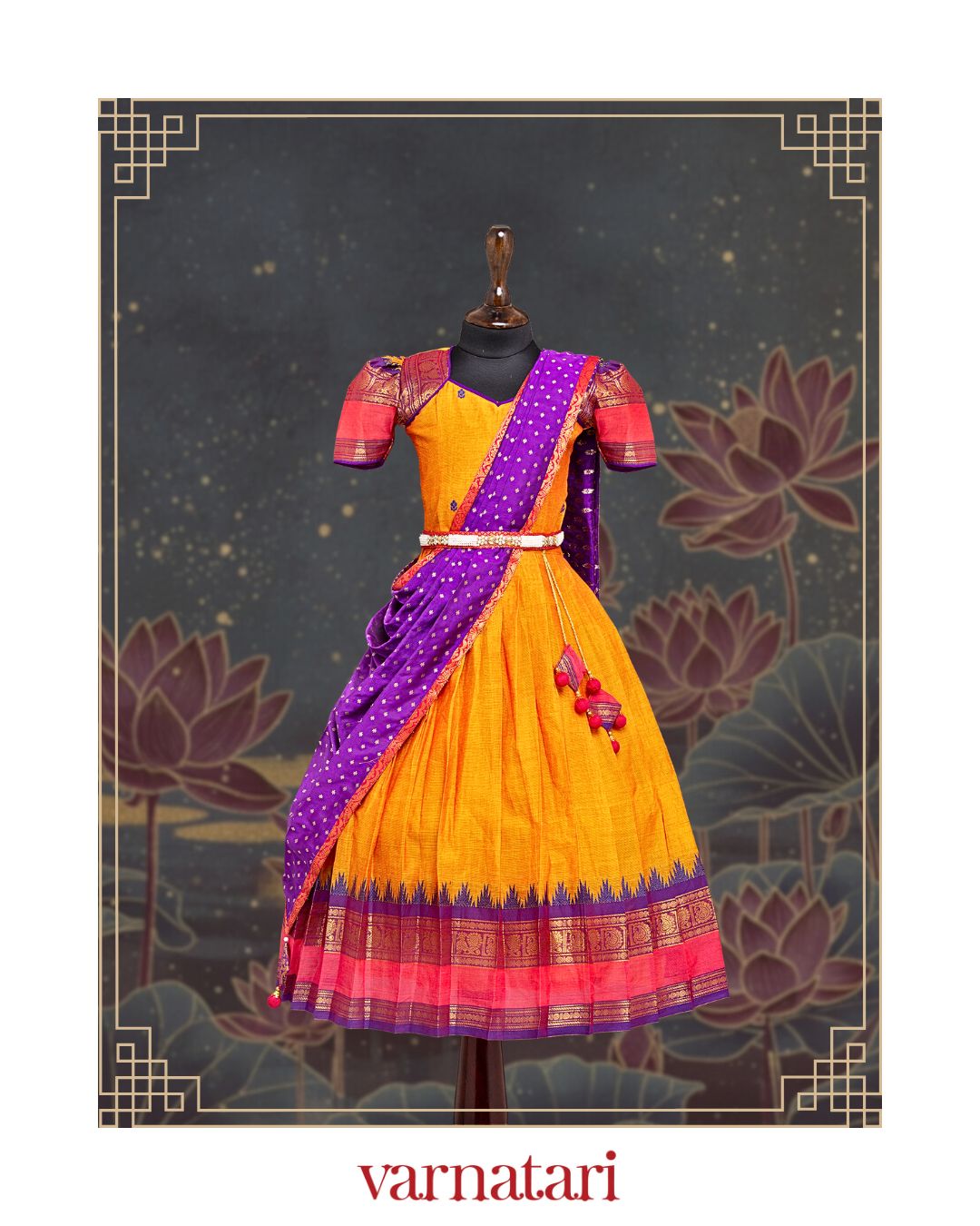 - Mango Yellow and Violet top and skirt with copper Kanchi border, Violet Cotton Dhupatta and kundan stone and white beads fabric hip belt