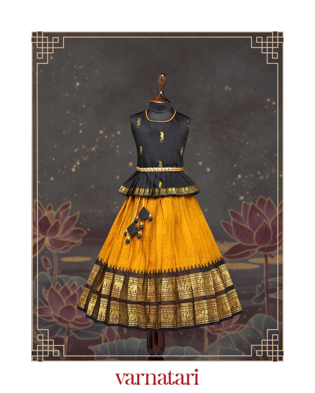 - Black peplum top and Mustard Yellow and Black Skirt and Gold Kanchi Border, Kundan stone fabric hip belt