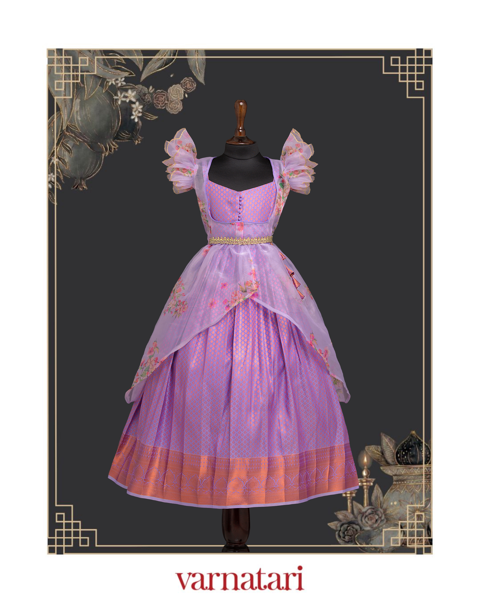 • Lavender Magenta and Copper Ethnic Anarkali with Copper jacquard prints and Copper Kanchi border, topped with Mauve floral Organza Coat and Kundan stone Fabric hip belt