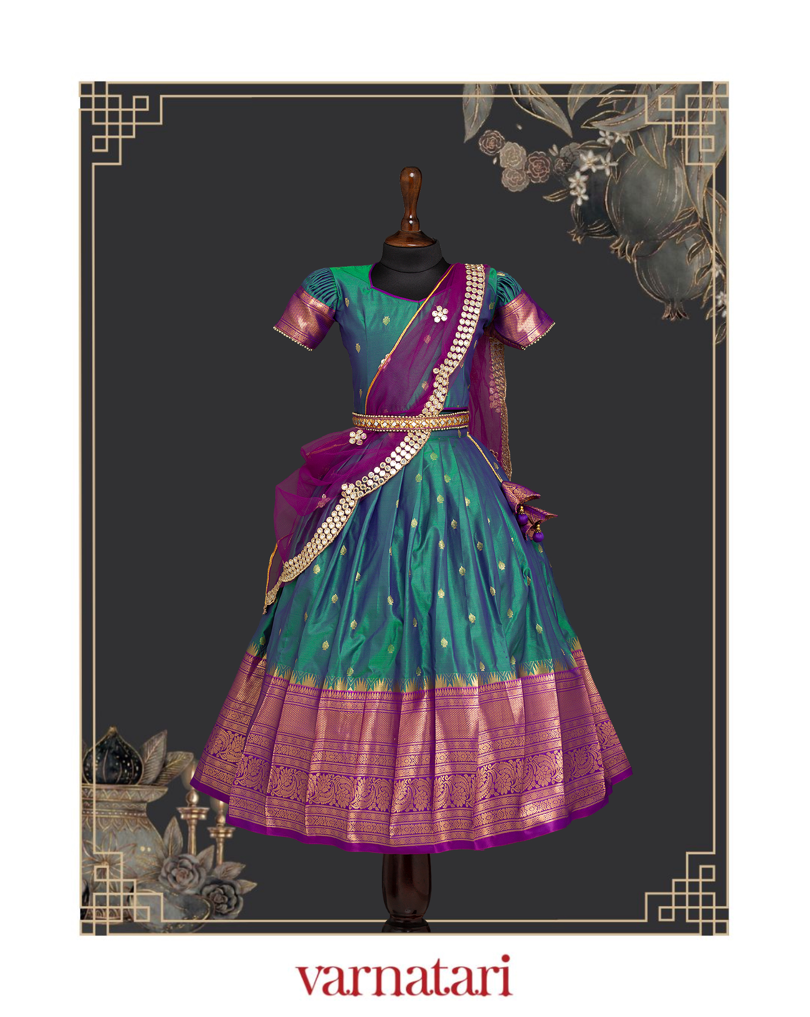 - Peacock Green and Violet top and skirt with gold flower patterns and gold Kanchi border, Magenta net Dhupatta and Kundan stone with beads fabric hip belt